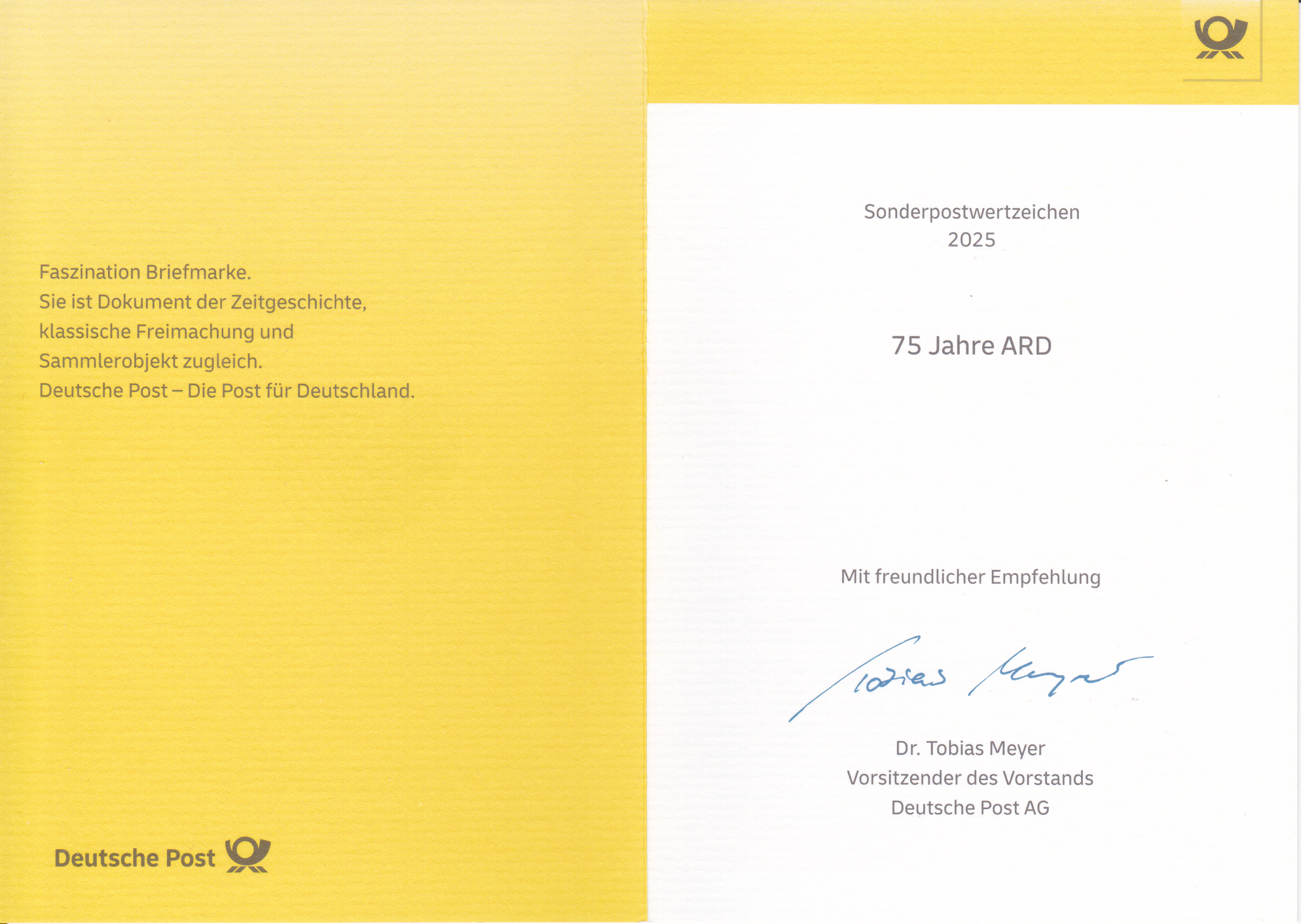 Klappkarte des Vorstandsvorsitzenden der Deutschen Post AG mit der Marke "75 Jahre ARD" (MiNr 3911) und dem Ersttagsonderstempel Bonn.