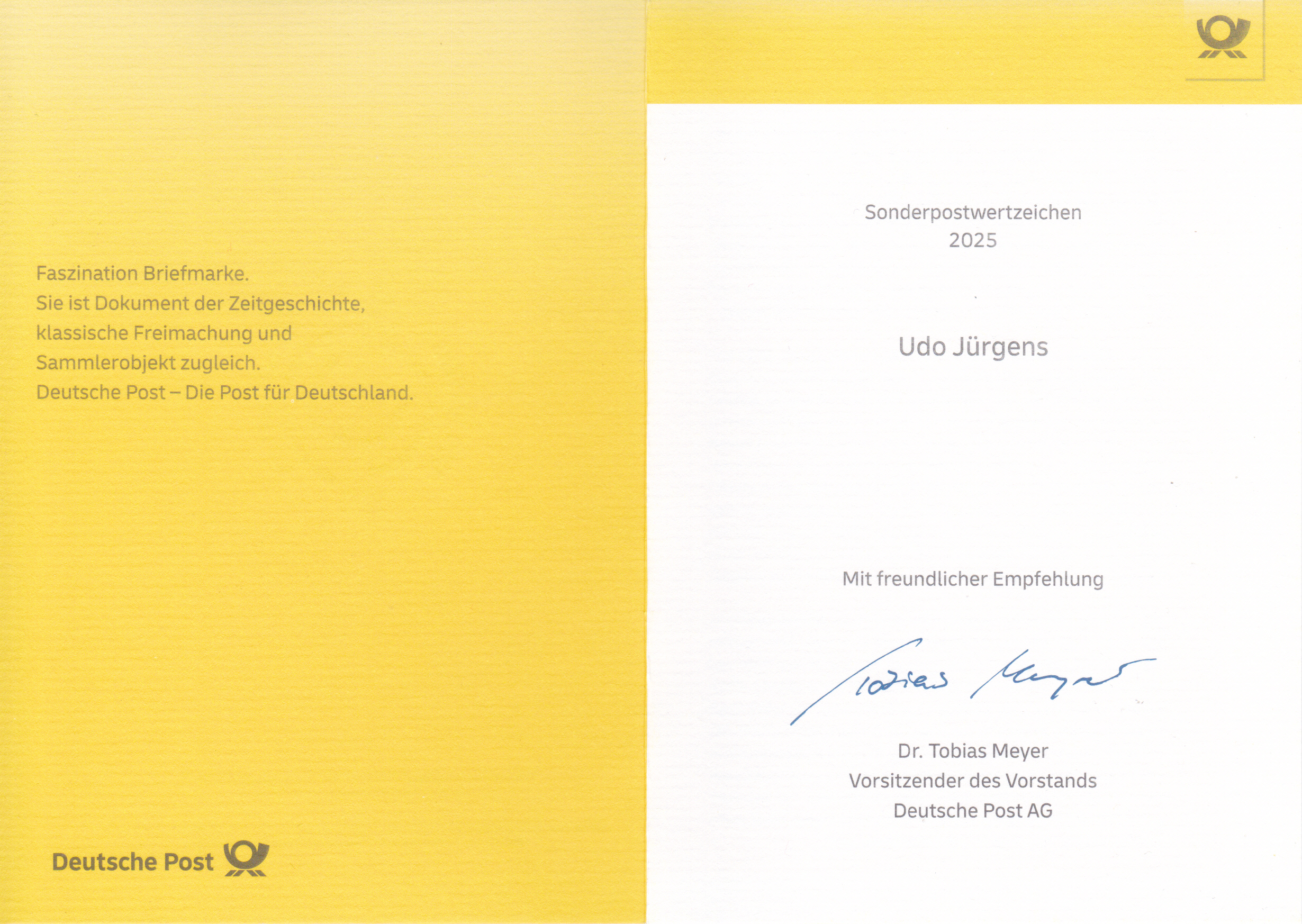 Klappkarte des Vorstandsvorsitzenden der Deutschen Post AG mit der Marke "Udo Jürgens" (MiNr 3927) und dem Ersttagsonderstempel Bonn.