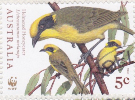 Auf einer Marke aus Australien (MiNr 1744) sind Gelbhaubenhonigfresser (Lichenostomus melanops) abgebildet.