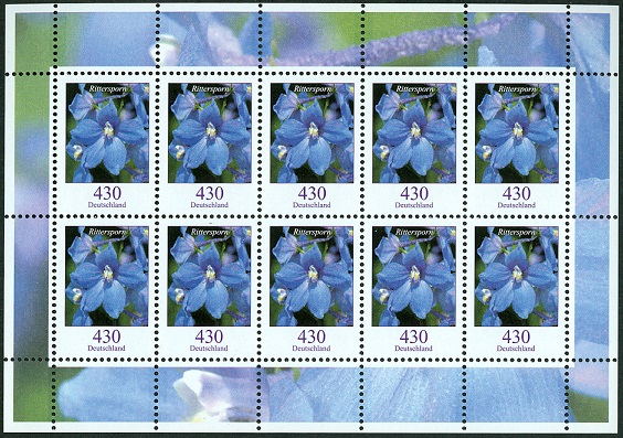 Dieses schöne Rittersporn-Blau wählte man 2005 für einen 430 Cent-Wert aus, um, gemeinsam mit einer Sonnenblume (95 Cent), eine neue Freimarkenserie für Deutschland zu beginnen. Ersttag der MiNr. 2435 war der 3. Januar 2005.