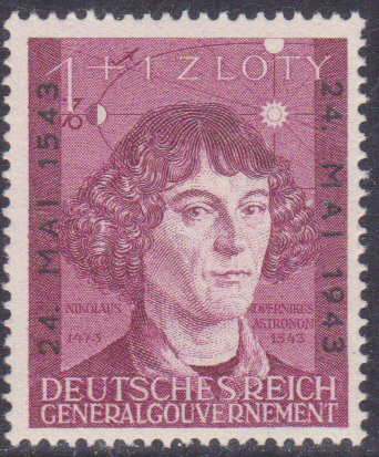 Zum 400. Todestag von Nikolaus Kopernikus erschien diese Marke Generalgouvernement MiNr. 104 in geänderter Farbe und links und rechts mit senkrechtem Eindruck des Sterbetages und des Gedenktages.