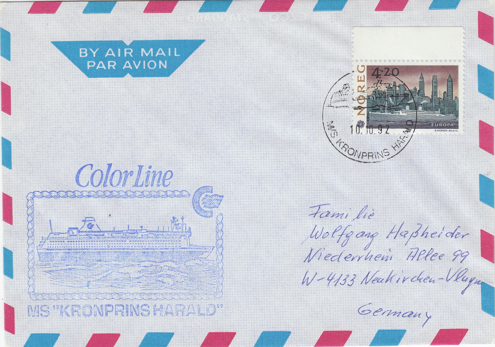 Hier ein Beleg vom 10.10.1992 mit Cachetstempel ColorLine sowie mit Entwertung der Frankatur per Bordstempel der MS KRONPRINS HARALD: