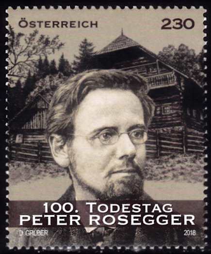 Zum 100. Todestag von Peter Rosegger ist in Österreich diese Marke (MiNr 3402) mit einem Porträt von Peter Rosegger und seinem Geburtshaus "Kluppeneggerhof" in Alpl erschienen.