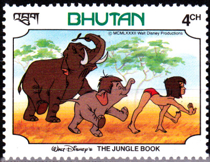 Auf dieser Marke aus Bhutan (MiNr 784) sehen wir wie Mowgli mit Colonel Haiti, dem Oberhaupt der Elefantenpatrouille, und Junior, dem kleinen Elefantenjungen, paradiert.