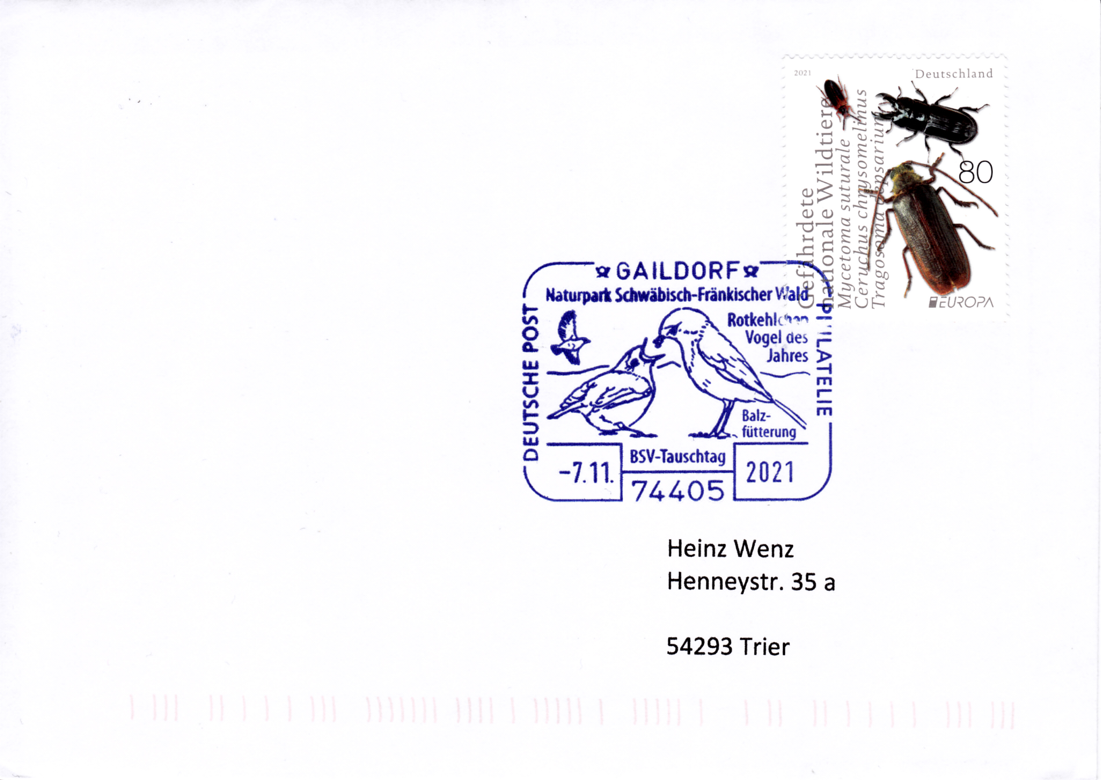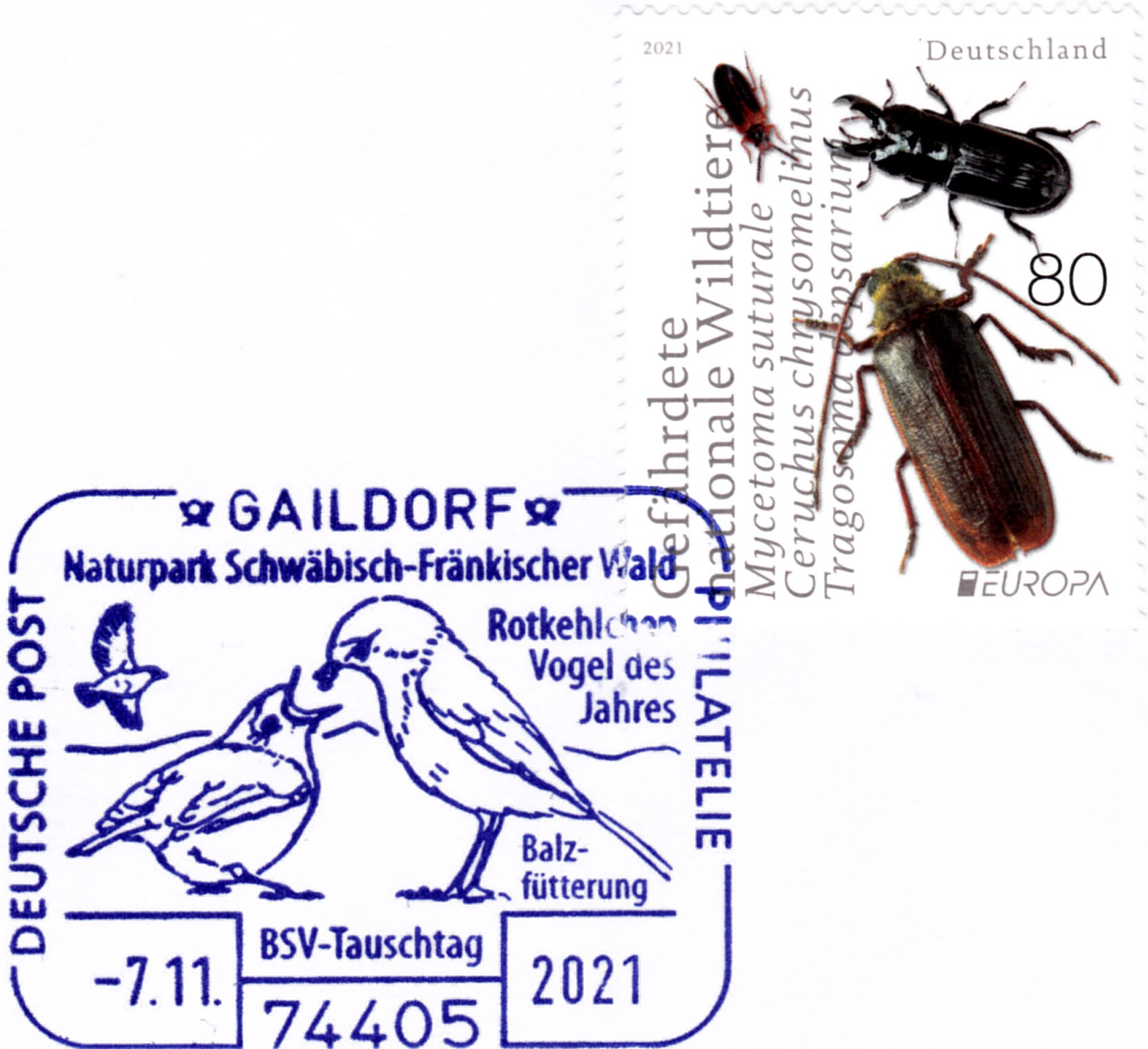 Im Sonderstempel vom 7.11.2021 aus Gaildorf wird eine Abbildung zur sogenannten Balzfütterung am Beispiel des Rotkehlchen, dem Vogel des Jahres 2021 gezeigt.