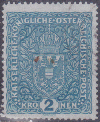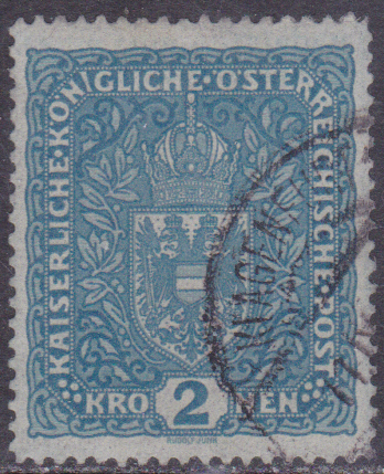 Aus einer späteren Ausgabe (1916) zeige ich eine Marke zu 2 Kronen (MiNr 200) in schwärzlichviolettultramarin. Die Kronen-Werte sind im Format etwas größer als die Heller-Werte. Ab 2 Kronen gibt es unterschiedliche Maße: I = Bildgröße 25×30 mm (schmales Format) und II = Bildgröße 26×29 mm (breites Format). Die hier gezeigte Marke ist eine MiNr 200 I.