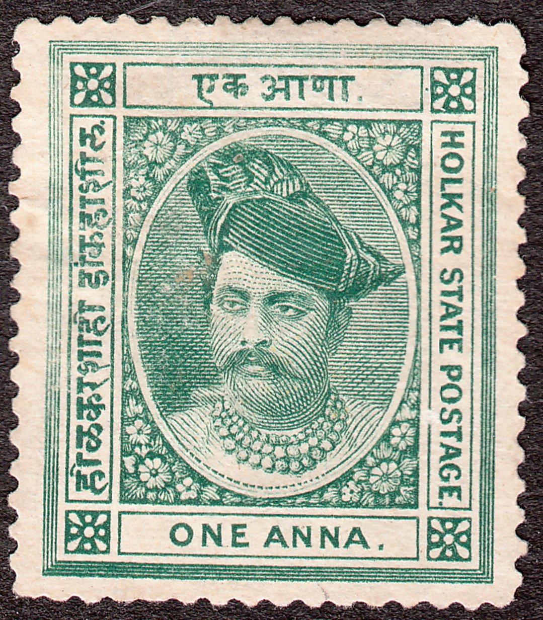 Diese als Indore MiNr. 5 katalogisierte Freimarke zu 1 Anna in grün mit dem Kopfbild von Maharadscha Schiwadschi Rao Holkar erschien 1892:
