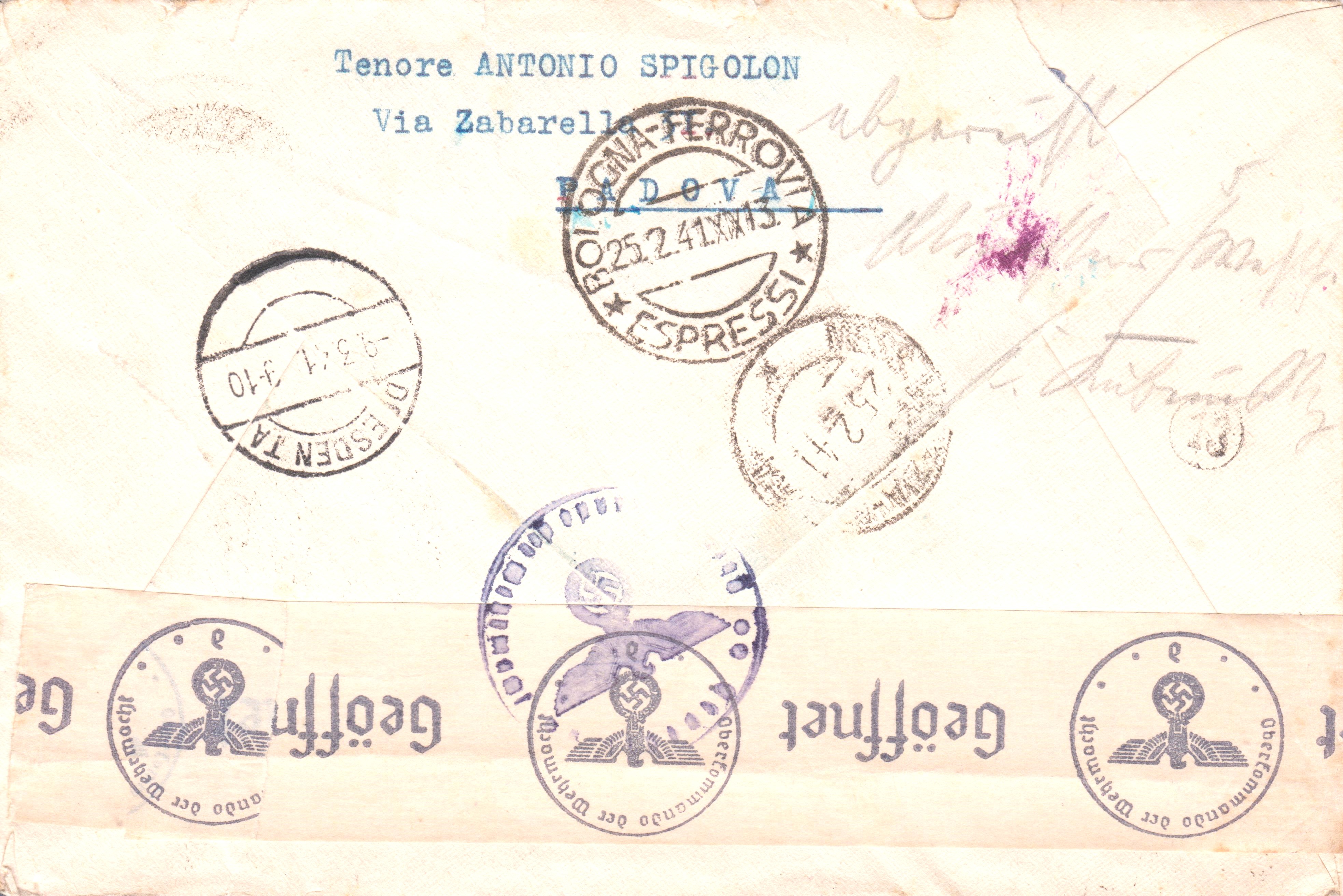 Dieser Eilbrief = "ESPRESSO" wurde nach Dresden adressiert am 25.02.1941 in PADOVA in Italien aufgegeben: