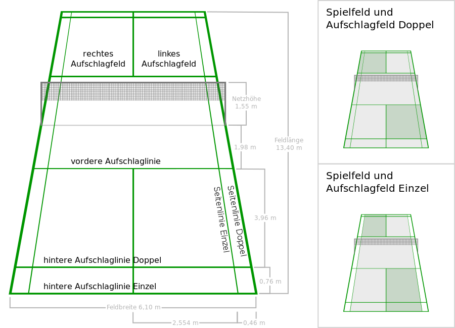 Zwei Fotos aus dem Fundus der Wikipedia Commons zeigen die Spielfeldaufteilung und eine Wettkampfszene eines Mönner-Doppel.