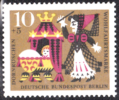 Bereits die Wohlfahrtsmarken 1964 zeigten Motive aus Dornröschen. Die Marke zu 10+5 Pf (MiNr 447) zeigt wie die Böse Fee den Fluch ausspricht.