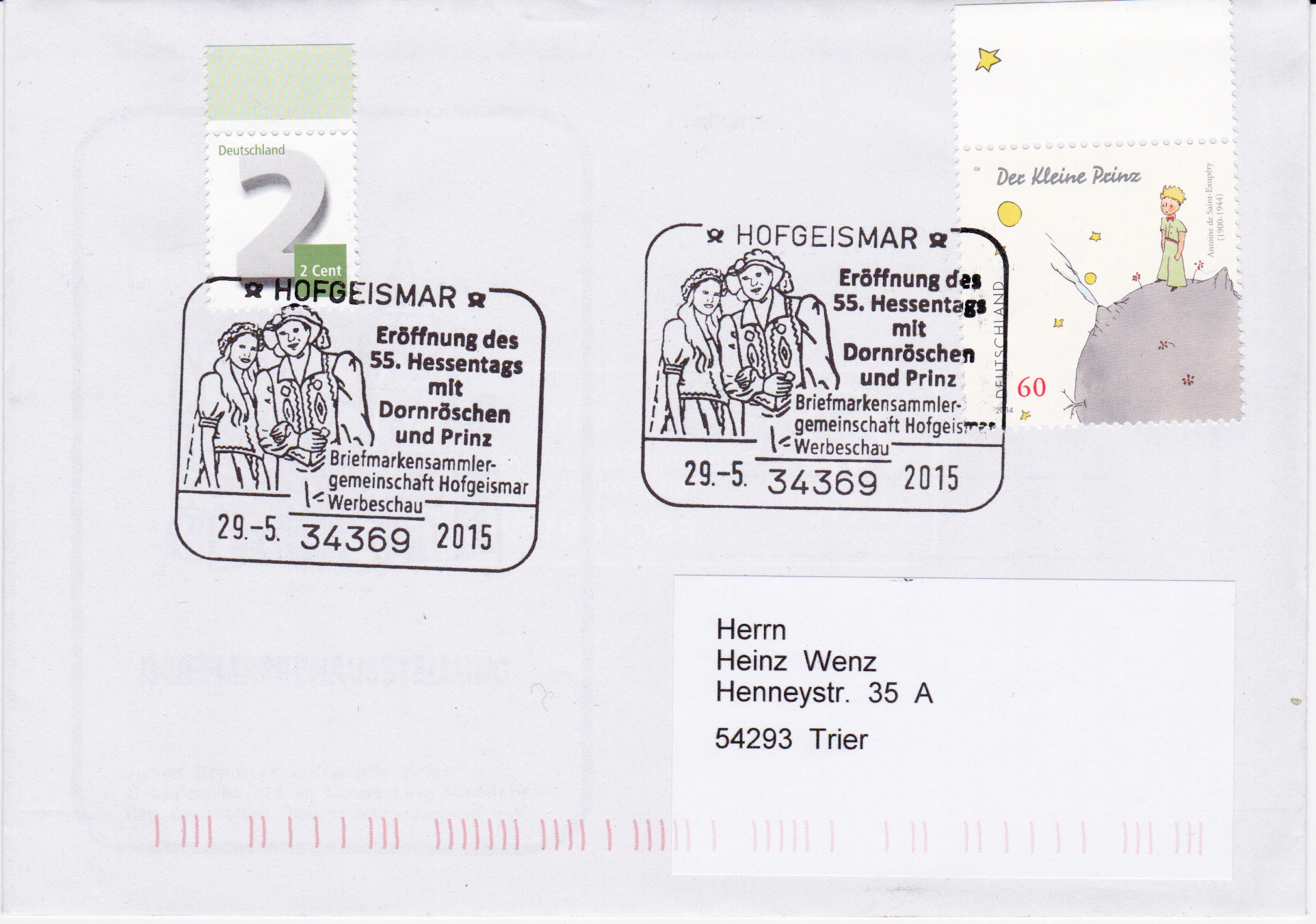 Hofgeismar ist eine Kleinstadt in Nordhessen an der Märchenstraße. Zur Eröffnung des 55. Hessentages 2015 gab es diesen Sonderstempel mit einer Abbildung von "Dornröschen und Prinz".