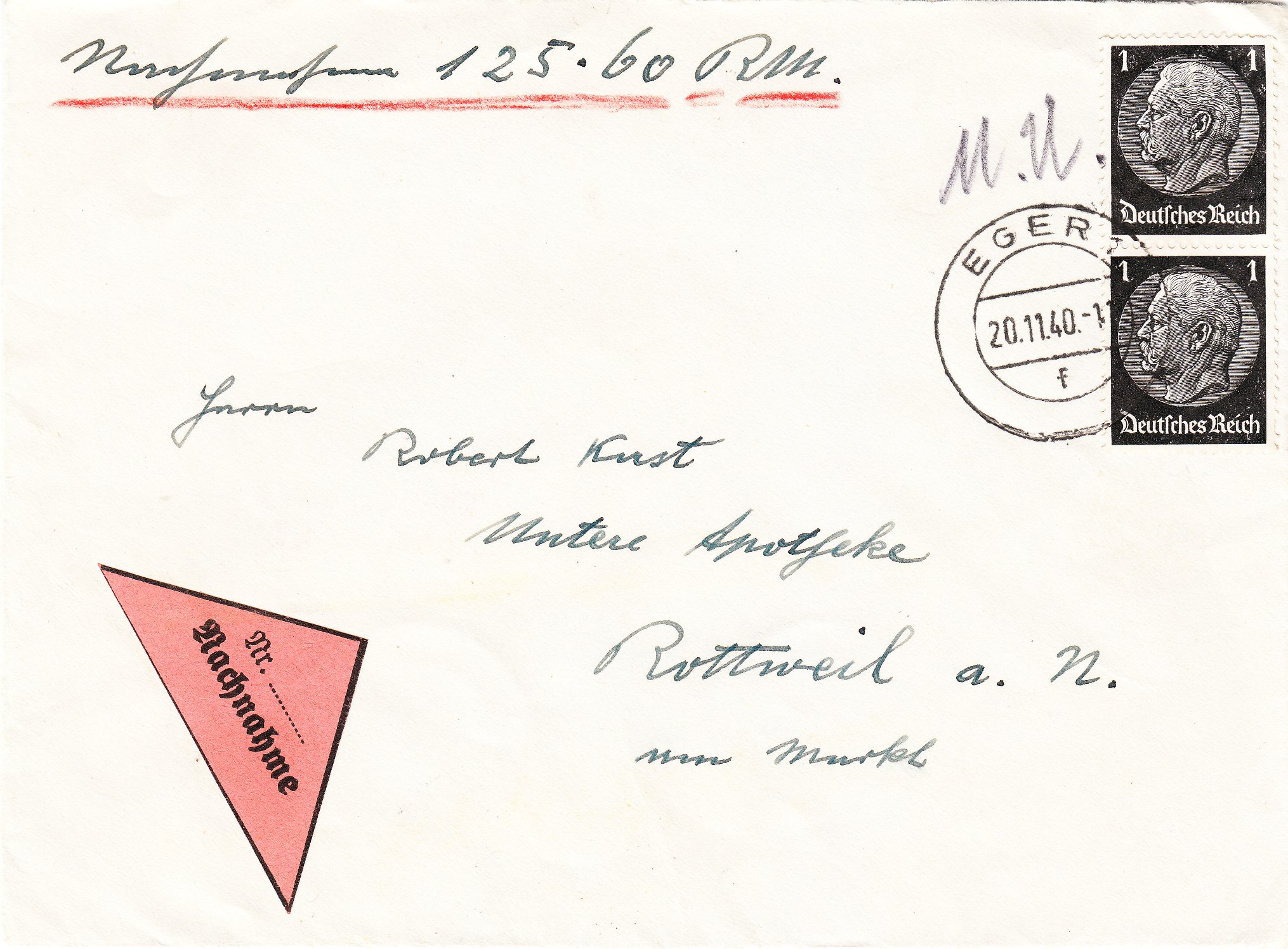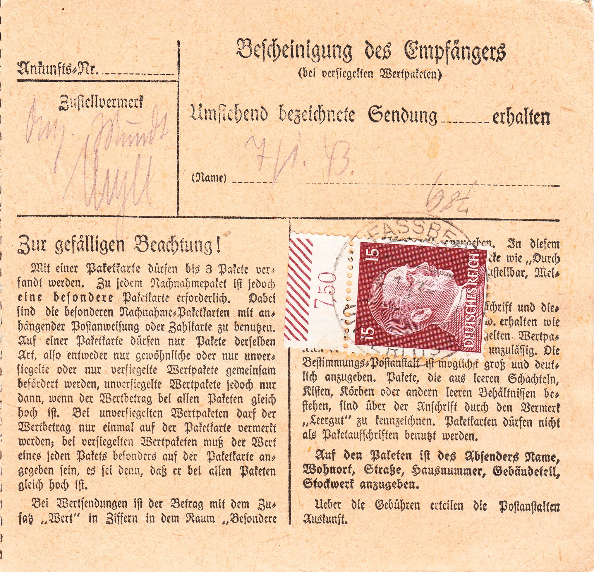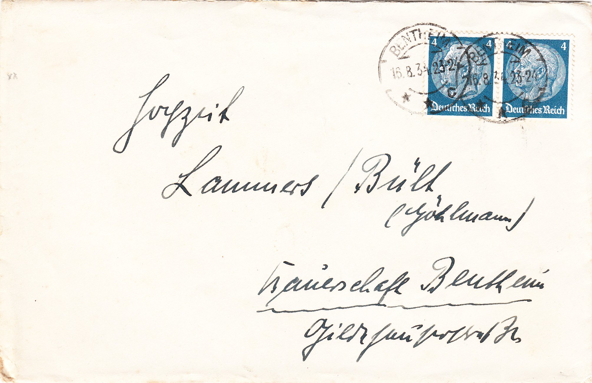 Sendungsart "Geschäftspapiere" am 07.04.1938 von Duisburg nach Plettenberg: