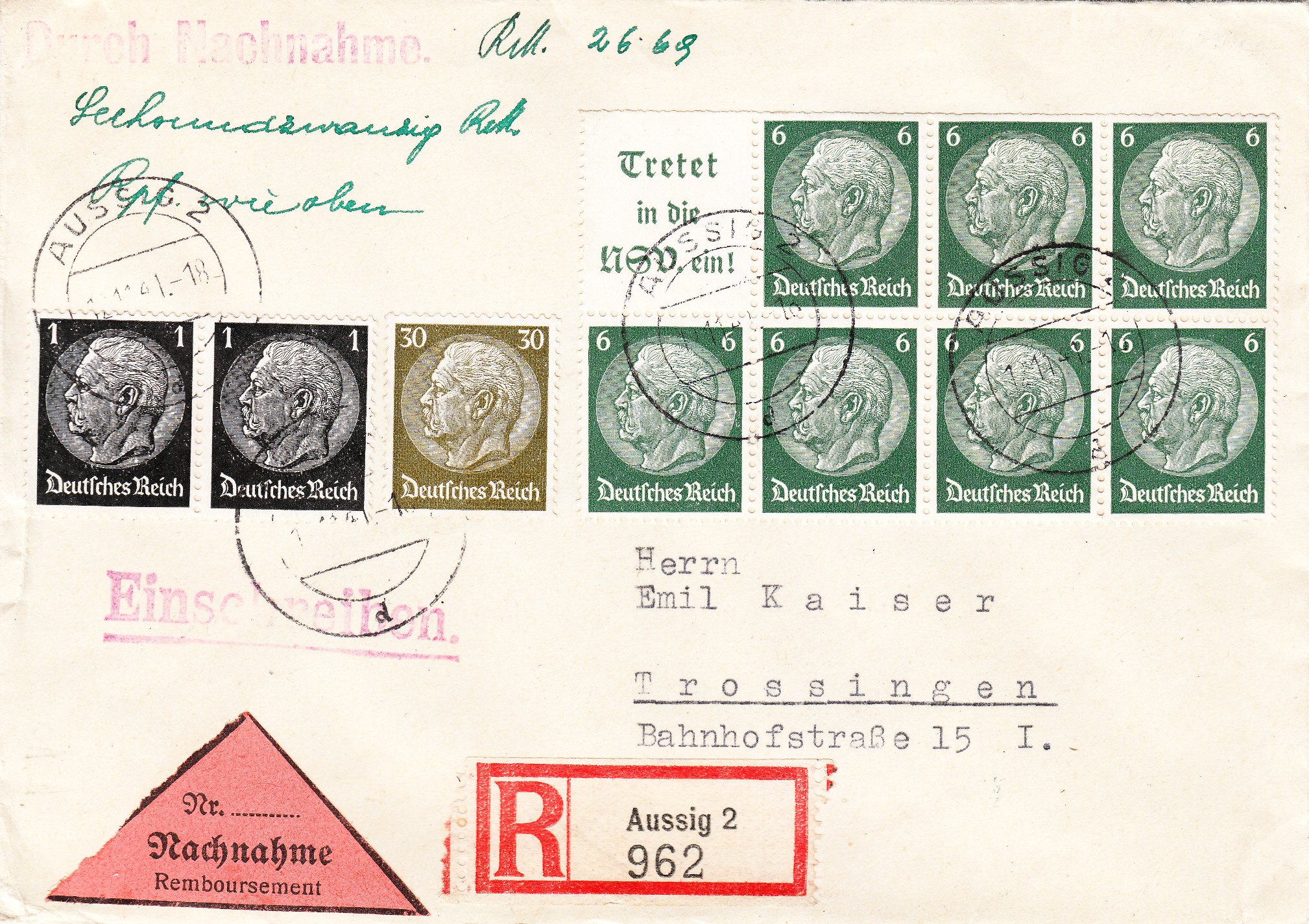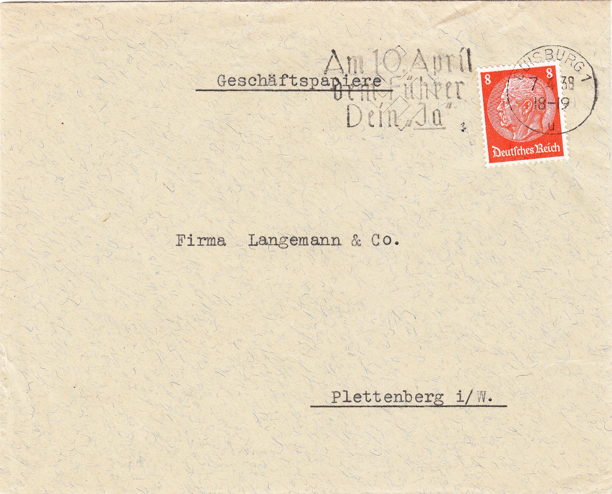 Der Maschinenstempel trägt einen Werbeeinsatz "Am 10.April dem Führer Dein "Ja"".