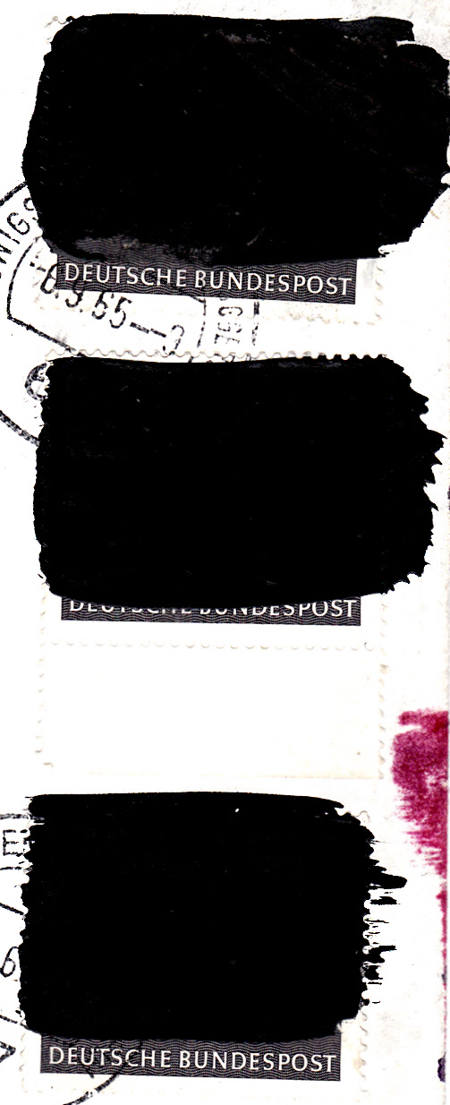 Auf diesem Brief per Einschreiben wurden am 6.9.1965 gleich drei Werte der MiNr 479 zur Frankatur benutzt und mit schwarzer Lackfarbe übermalt. Der Brief ist mit 10 Pf überfrankiert.