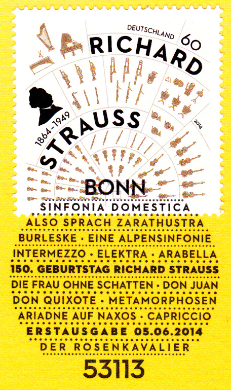 Zum 150. Geburtstag von Richard Strauss erschien bei der Deutschen Post am 5.6.2014 eine Sondermarke zu 60 Cent. Sie zeigt im Bild Richard Strauss (1864-1949) und die Musikinstrumente eines Orchesters.