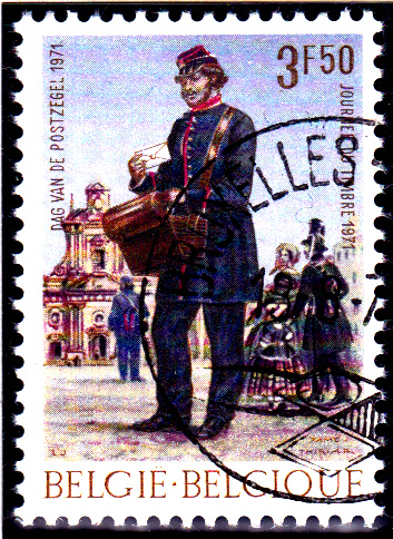 Diese Marke (MiNr 1631) erschien am 25.4.1971 in Belgien zum Tag der Briefmarke 1971. Sie zeigt im Bild einen Briefträger zu Fuß nach einem Gemälde von James Thiriar.