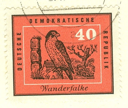Auch die MiNr. 703 zeigt einen Wanderfalken. Diese 40 Pfennig-Marke erschien am 2. Juli 1959 innerhalb einer DDR-Ausgabe "Heimische Vögel".