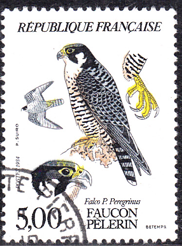 Ein weiterer Wanderfalke (Falco peregrinus) ist auf dieser Marke aus Frankreich (MiNr 2466) zu sehen. Daneben werden sein Flugbild und je eine Detailansicht von Kopf und Bein mit Krallen gezeigt.
