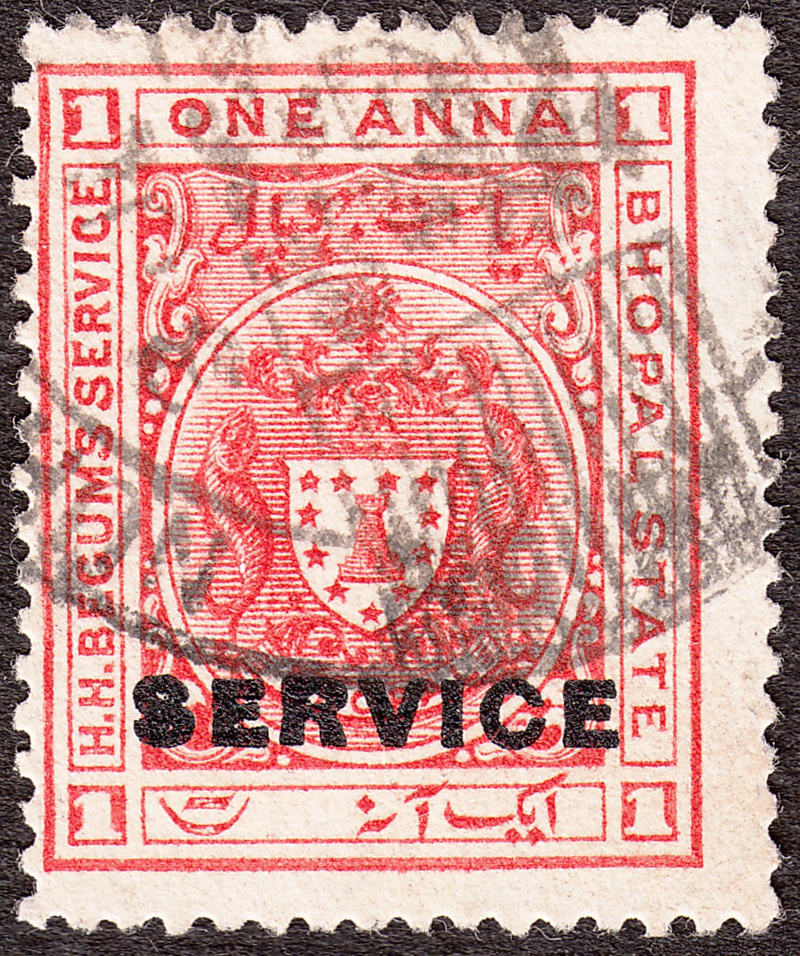 Diese Dienstmarke zu 1 Anna in karmin mit Aufdruck "SERVICE" trägt die Inschrift "H. H. BEGUMS SERVICE - BHOPAL STATE" und wurde katalogisiert als Bhopal MiNr. D 2: