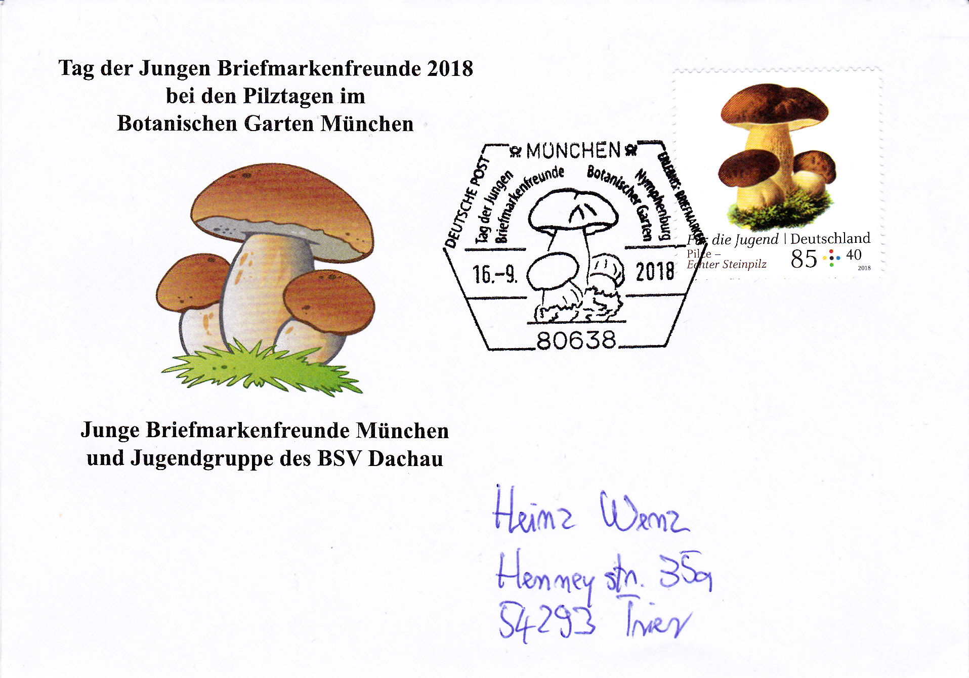 Im Sonderstempel aus München vom 19.09.2018 zum "Tag der Jungen Briefmarkenfreunde" 2018 wird nur der Steinpilz im Stempelbild gezeigt.