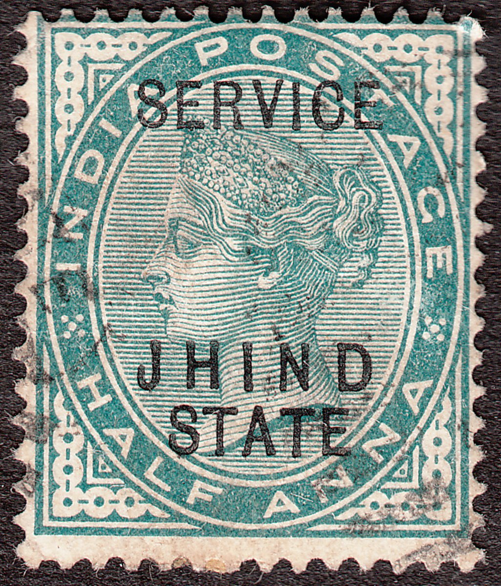 Die Freimarke Indien MiNr. 31 wurde mit zweizeiligem schwarzem Aufdruck "JHIND STATE" versehen als Freimarke Jind MiNr. 14 ausgegeben. Diese wiederum wurde mit einem weiteren schwarzen Aufdruck waagerecht "SERVICE" versehen und erschien 1893 als Dienstmarke Jind MiNr. D 8:
