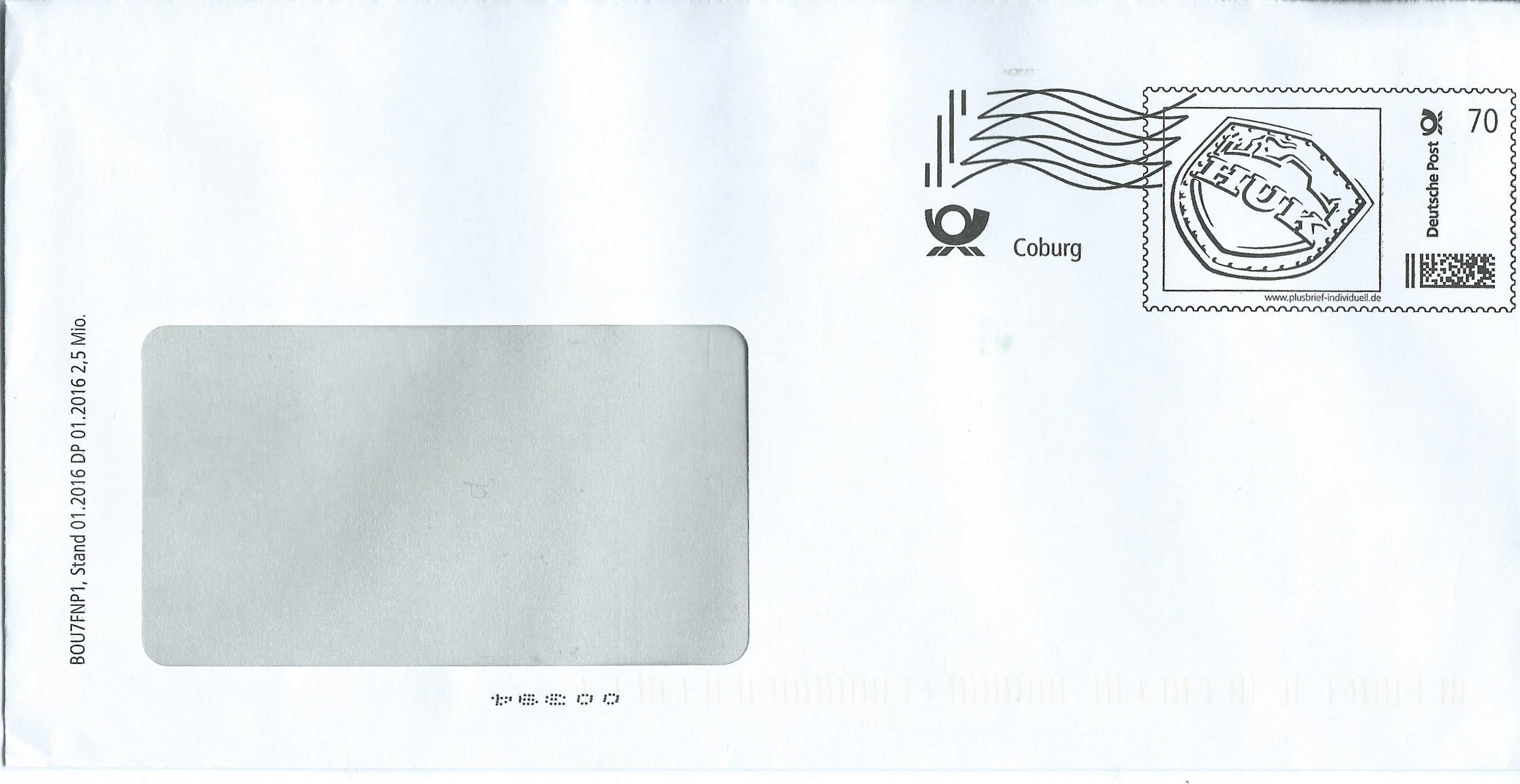von den ziemlich zu Anfang gezeigten Umschlägen der Versicherung HUK Coburg habe ich eine weitere Wertstufe erhalten können: 70 ct entwertet mit der Frankierwelle ohne Datum. Hier gilt es wieder, den Druckvermerk links am Rand zu beachten. Es ist davon auszugehen, dass im Laufe des Jahres weitere Auflagen hinzu kommen werden. Das habe ich bei dem Standard-Brief-Porto in der Vergangenheit immer beobachten können. Also: Augen auf