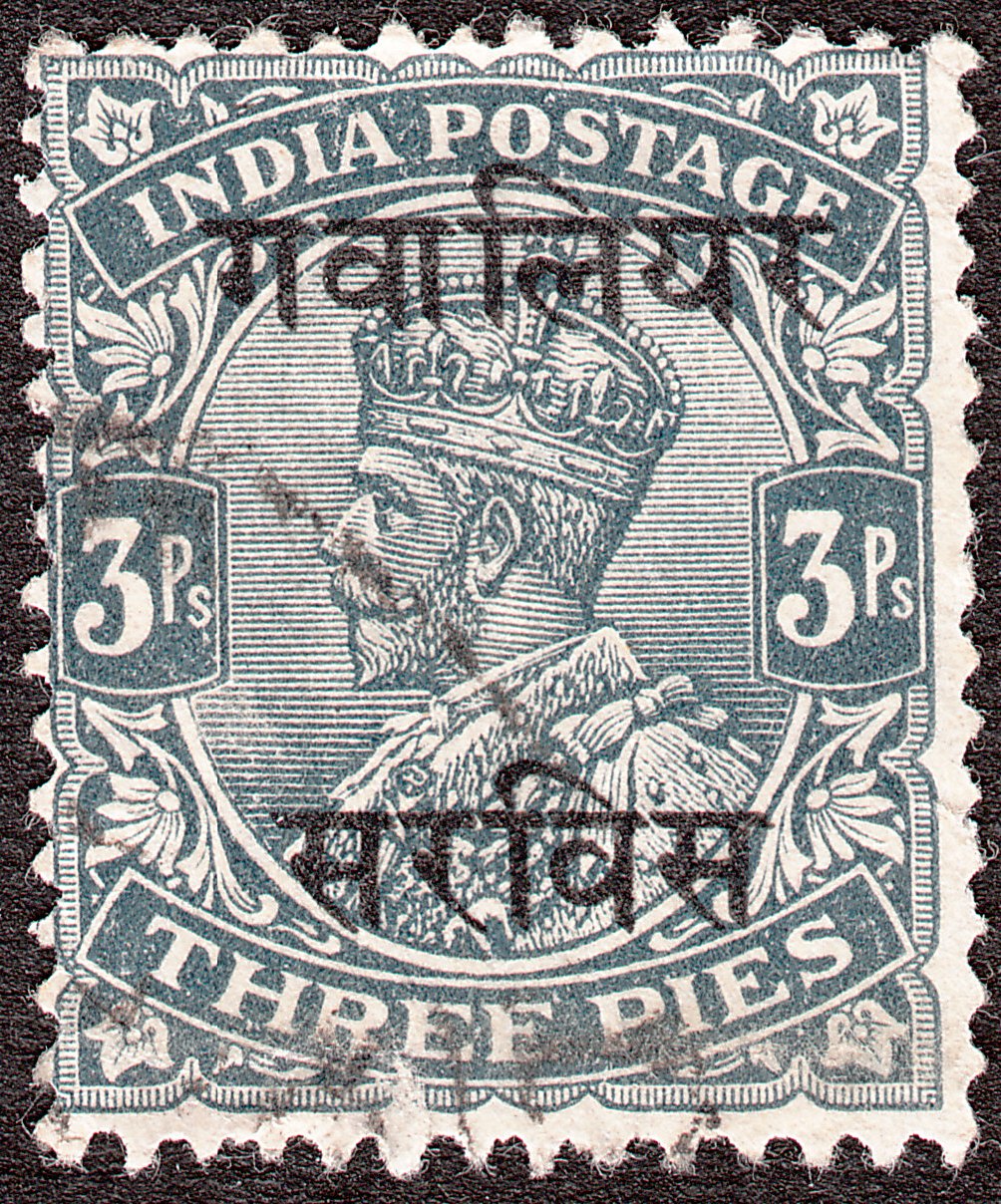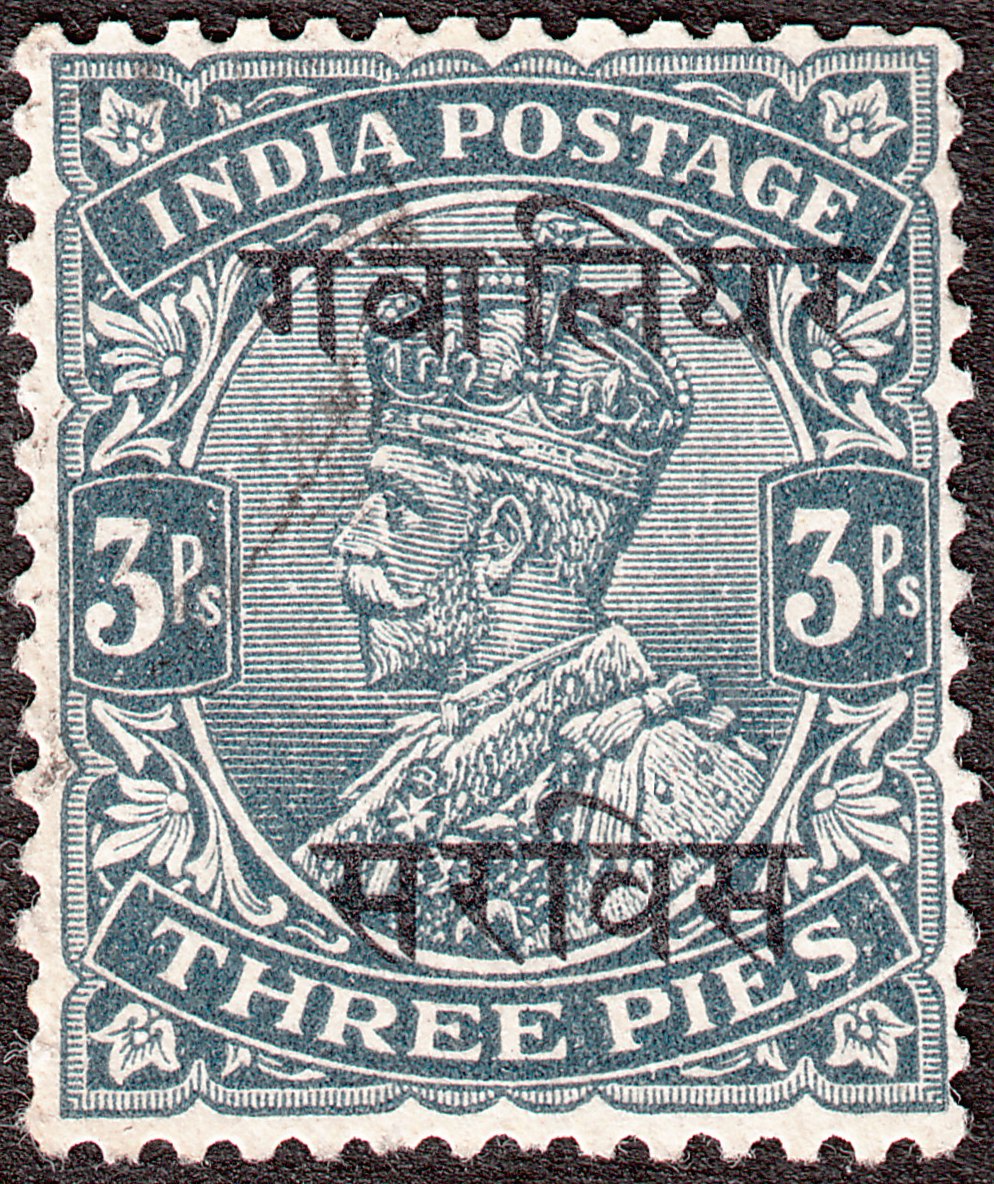Die Freimarke Indien MiNr. 100 zu 3 Pies in grau wurde mit zweizeiligem schwarzem Aufdruck versehen ausgegeben und ist katalogisiert als MiNr. D 30: