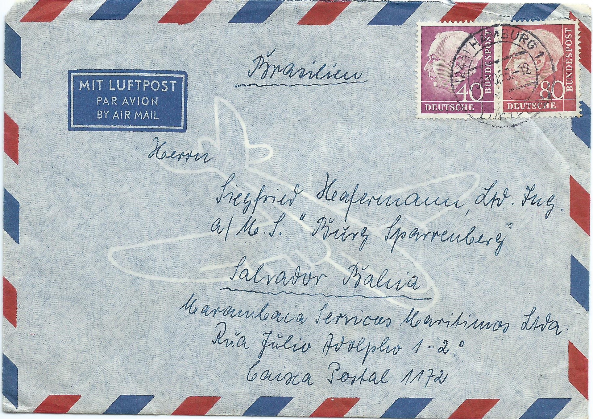 Und abschliessend ein Luftpostbrief nach Kolumbien mit einer reinen Heuss II-Frankatur: Je ein Wert zu 50 und 80 Pf, gestempelt 10.10.58 in Hamburg-Wandsbek.