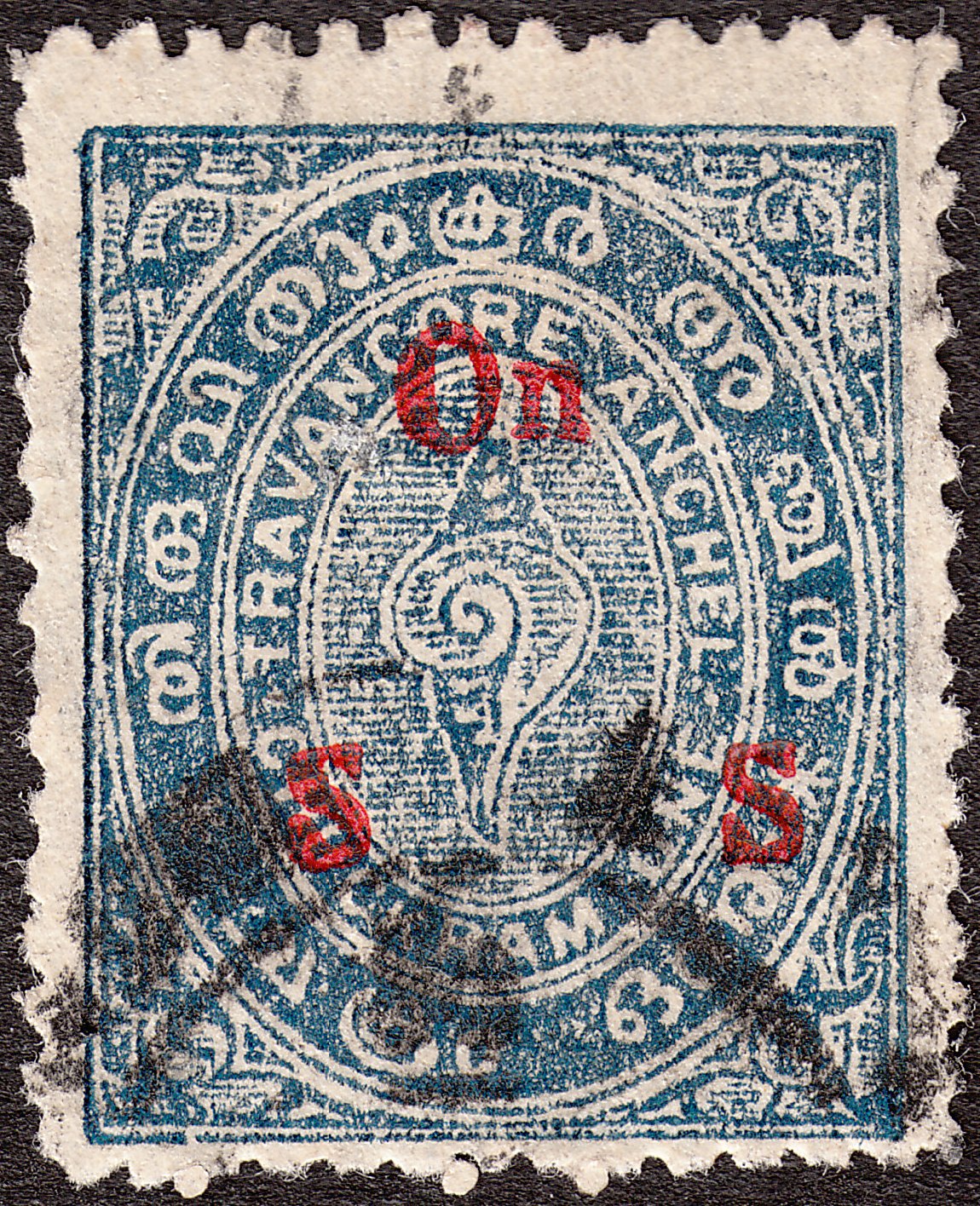 Die Freimarke Travancore MiNr. 13 zu 1 Chukram in blauschiefer wurde mit rotem Aufdruck "On S S" in Type II versehen als Dienstmarke Travancore MiNr. D 30 ausgegeben:
