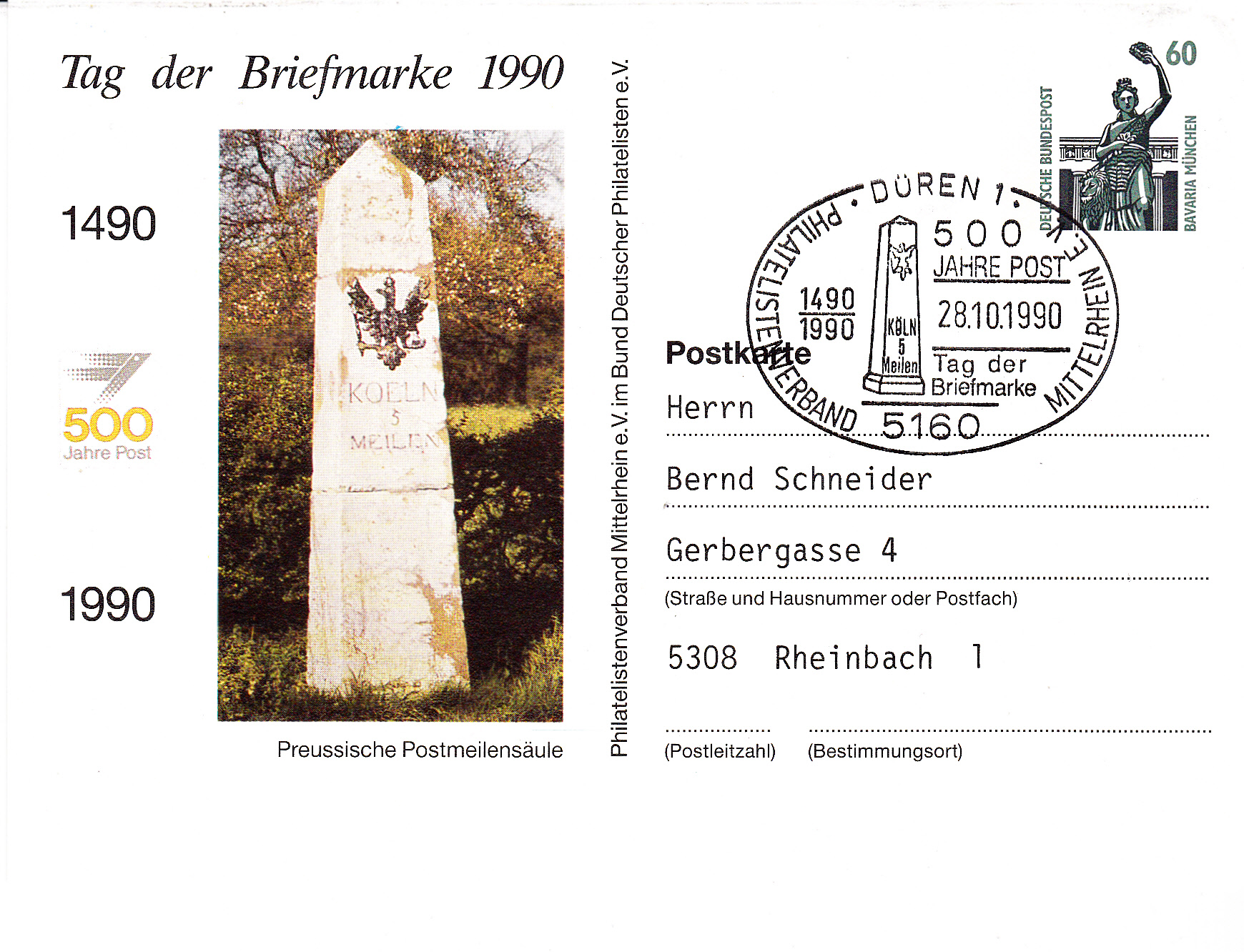 Diese Ganzsache gab es beim Landesverband Mittelrhein zum Tag der Briefmarke 1990. Der dazu passende Sonderstempel wurde am 28.10.1990 beim Postamt Düren geführt. Ganzsache und Sonderstempel zeigen eine preußische Postmeilensäule.