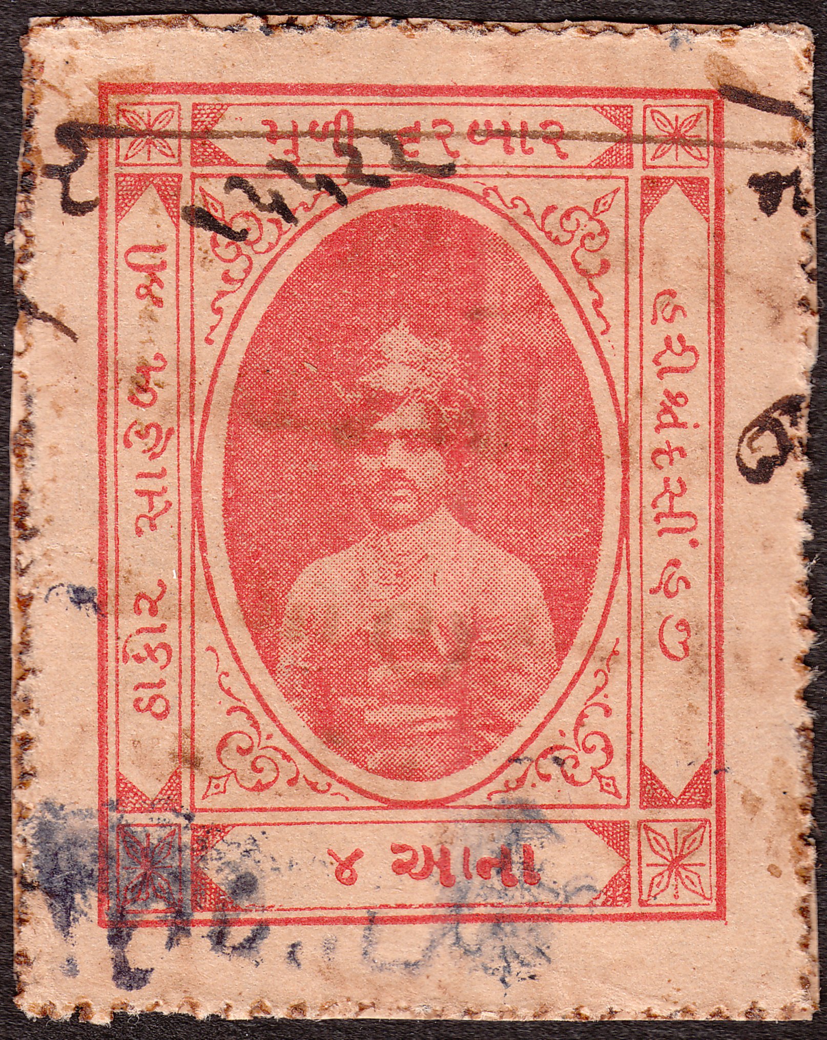 Diese Gebührenmarke aus Muli in Type 24, katalogisiert als KM 243, zeigt als Motiv Thakur Harish Chandra Singhji: