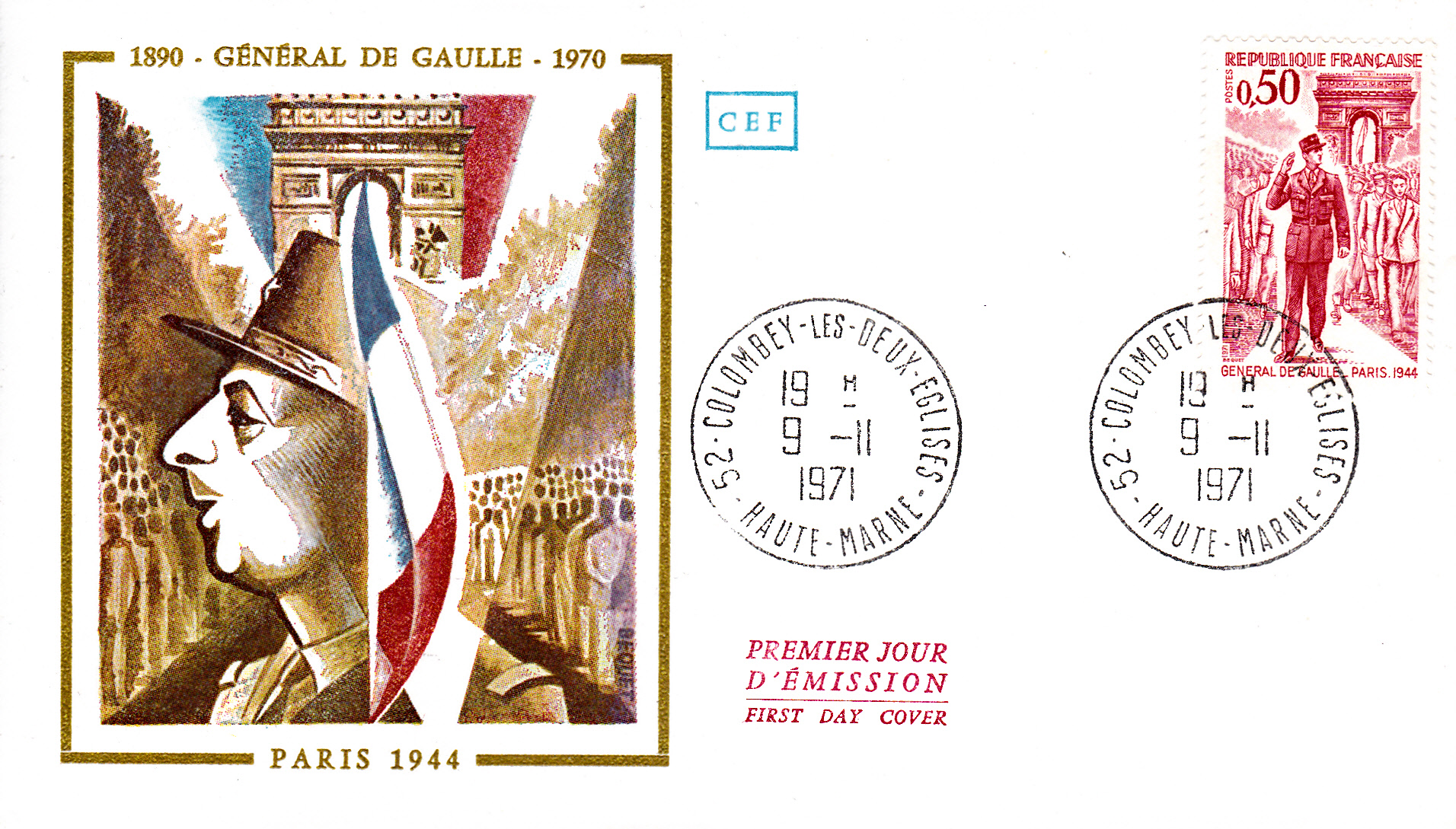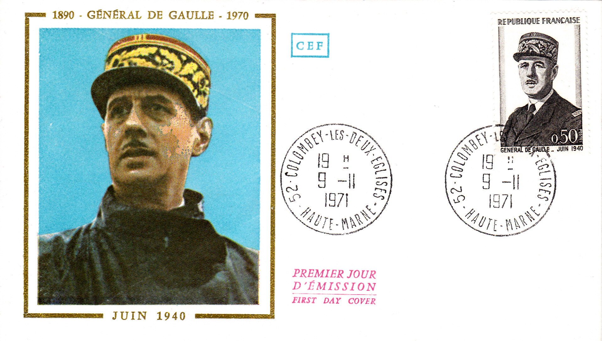 Auf diesem FDC wurde die Marke mit einem Ortsstempel in Colombey-les-Deux-Églises, dem Sterbeort von Charles de Gaulle, gestempelt.