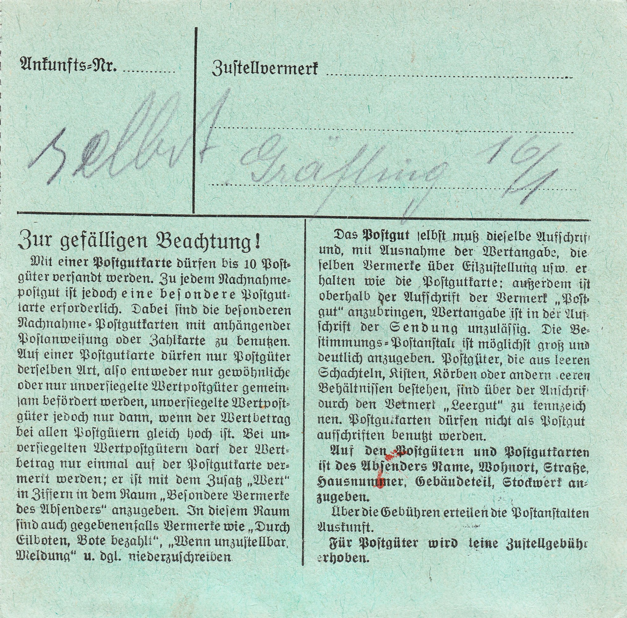 Die Sendungsart "Postgut" wurde zum 15.01.1933 zur Förderung der Wirtschaft von der Deutschen Reichspost eingeführt. Es handelte sich hierbei um Paketsendungen bis 7 kg, die von Firmen mit bis zu 10 Stück auf einer solchen grünen Postgutkarte eingeliefert werden konnten.