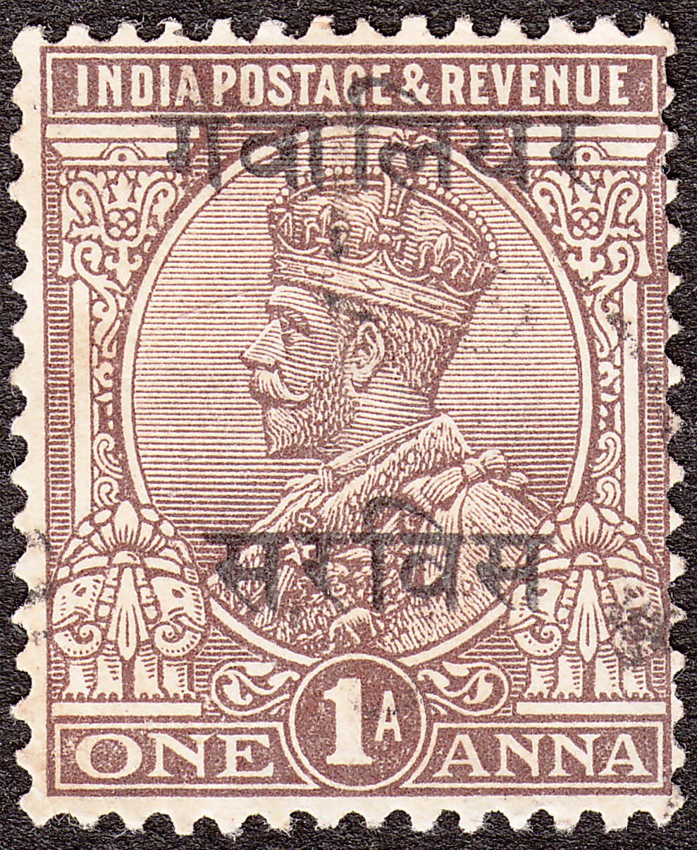 Die Freimarke Indien MiNr. 102 zu 1 Anna in braun wurde mit schwarzem Aufdruck versehen als Dienstmarke ausgegeben und als Gwalior MiNr. D 33 katalogisiert: